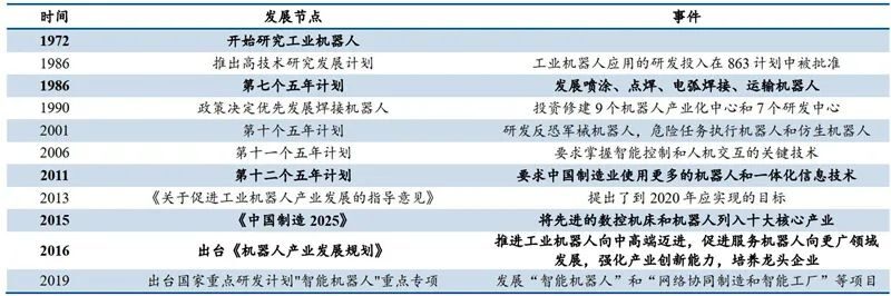 2013 年之后,国家出台了一系列政策对工业机器人的发展提出详细规划,并多次重申其重要性。主要政策包括:1)2013 年的《关于推进工业机器人产业发展的指导意见》;2)2015 年的《中国制造 2025》;3)2016 年的《机器人产业发展规划(2016-2020 年)》。