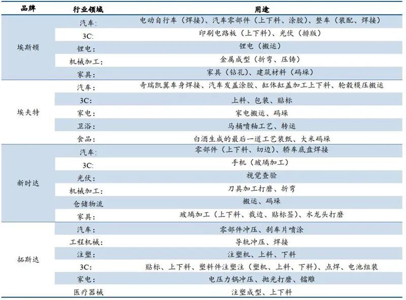 ▲ 国内外工业机器人供应商下游应用领域占比情况