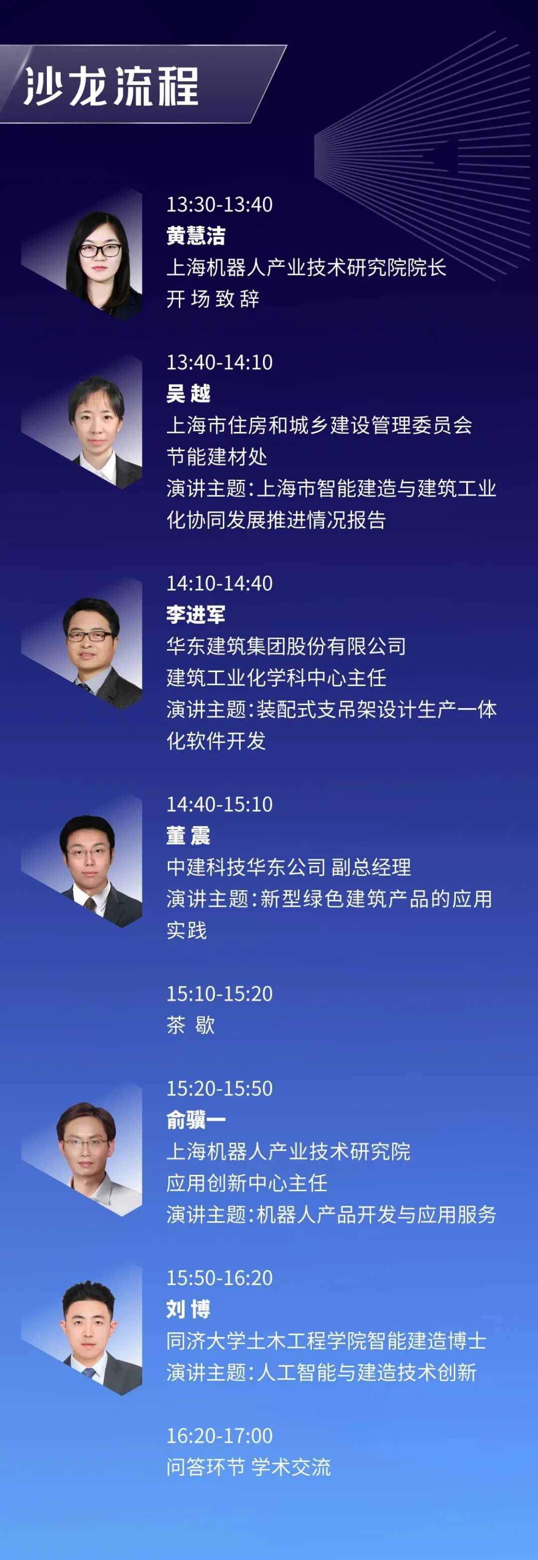本次沙龙特邀上海市住房和城乡建设管理委员会节能建材处、米兰国际足球赛官网、中建科技、华建集团、 同济大学土木工程学院五位大咖与大家深度分享智能建造技术与产业协同,产品与项目实践,创新与发展融合。